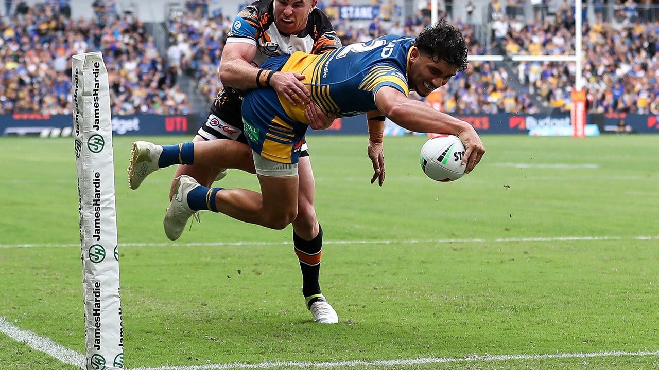 That’s despite the fact the Eels scrambling defence has compressed their middles, providing more space on the outside for the Tigers to attack. The Tigers scored on the ensuing play.